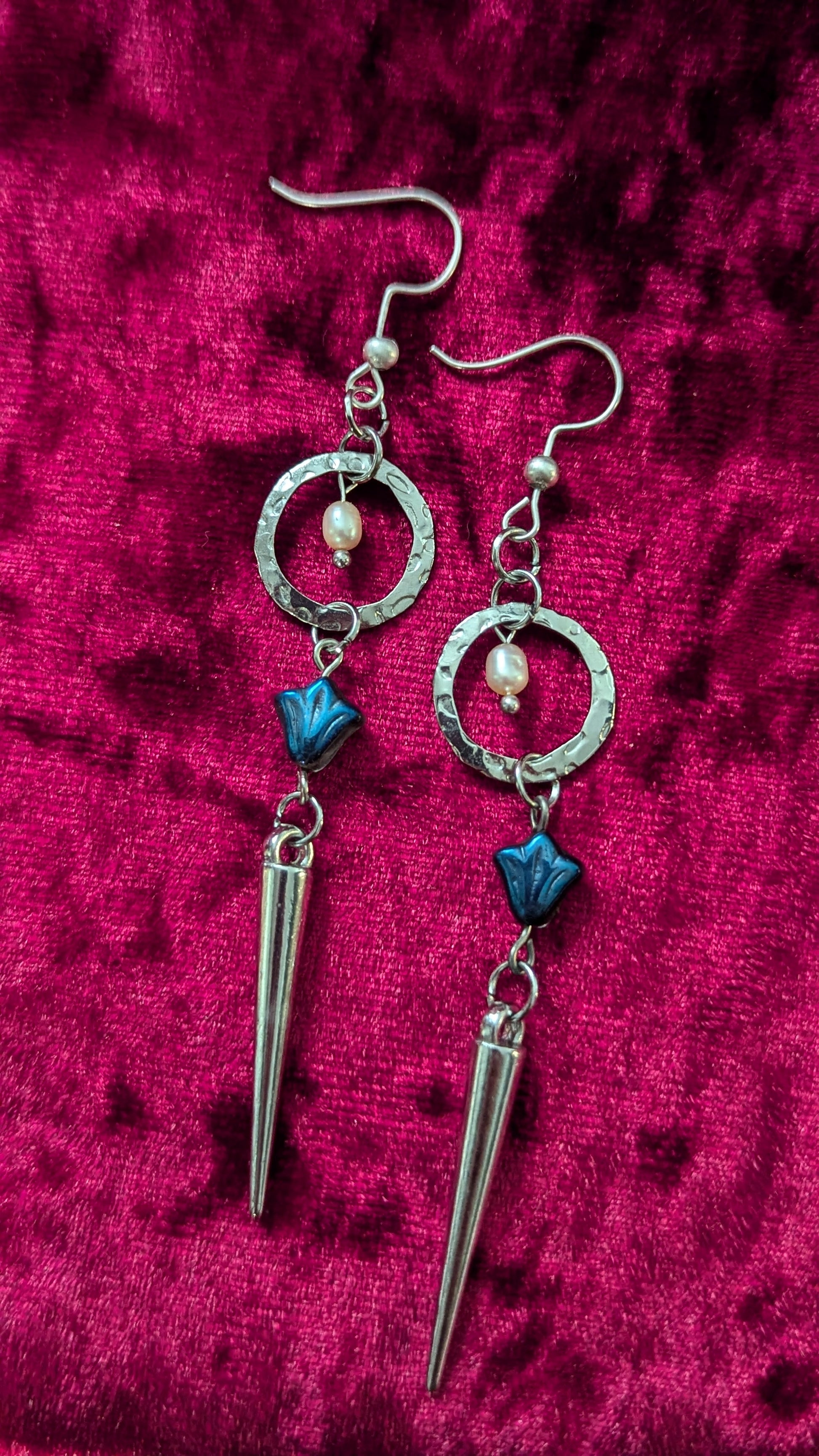 Darkly elegant and refined, these earrings pair luminous freshwater pearls with hammered metal rings and sleek spikes. A perfect balance of edge and grace, they catch the light with every movement.