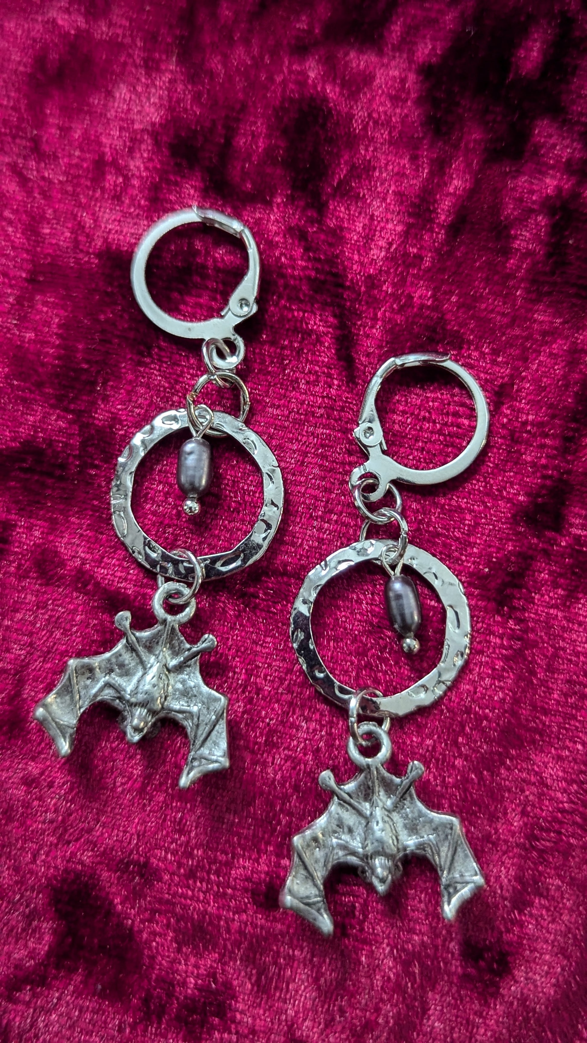 Dangle earrings featuring delicate bat charms and freshwater pearls... perfect for those who love a touch of mystery.