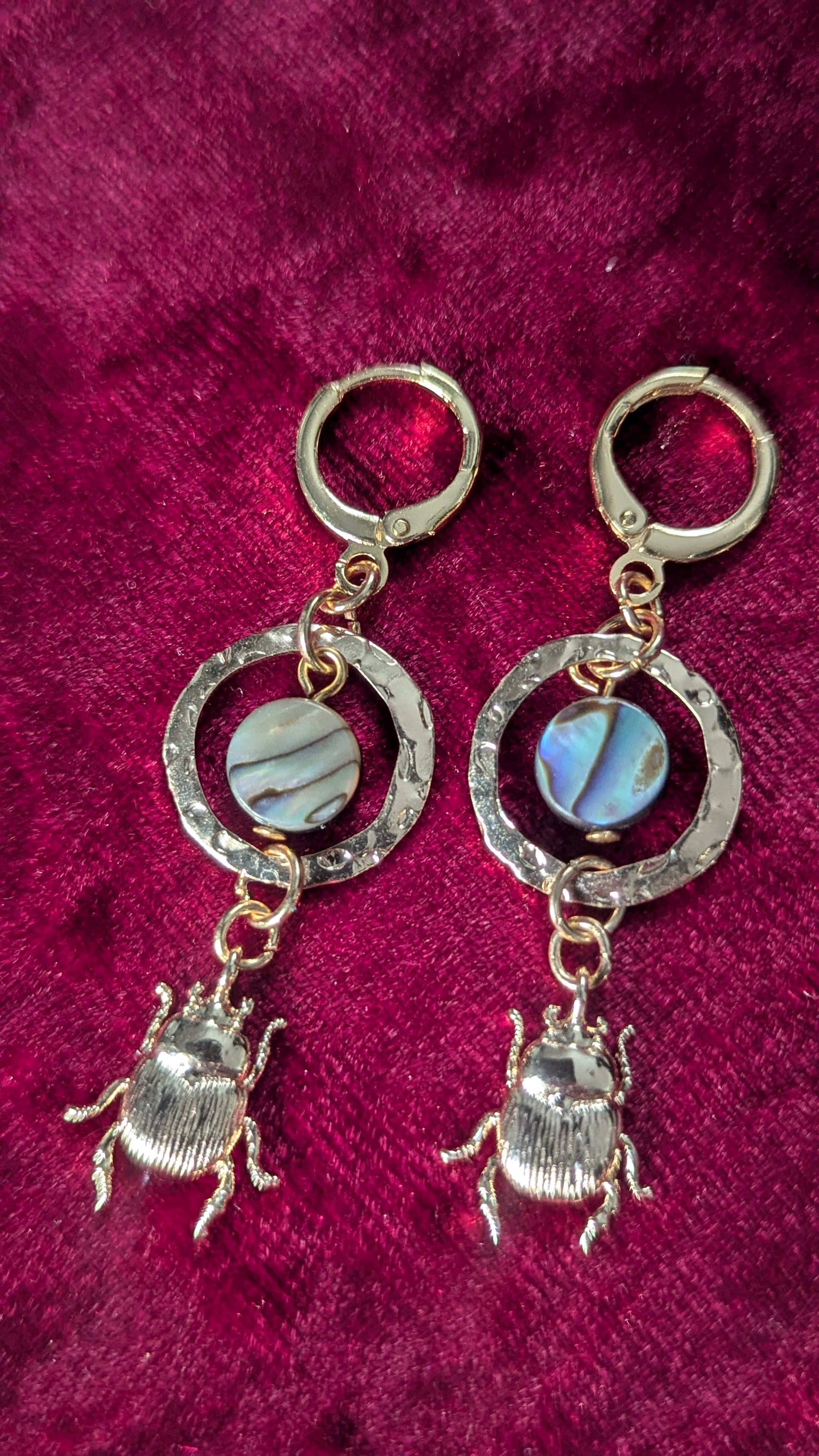 Gilded symbols of transformation and protection. Each earring features a shimmering abalone shell encircled in textured gold, with a delicate scarab charm suspended below. The iridescent blues and greens shift like ancient treasure under light, evoking the mystery of desert nights and sacred relics reborn in modern form.